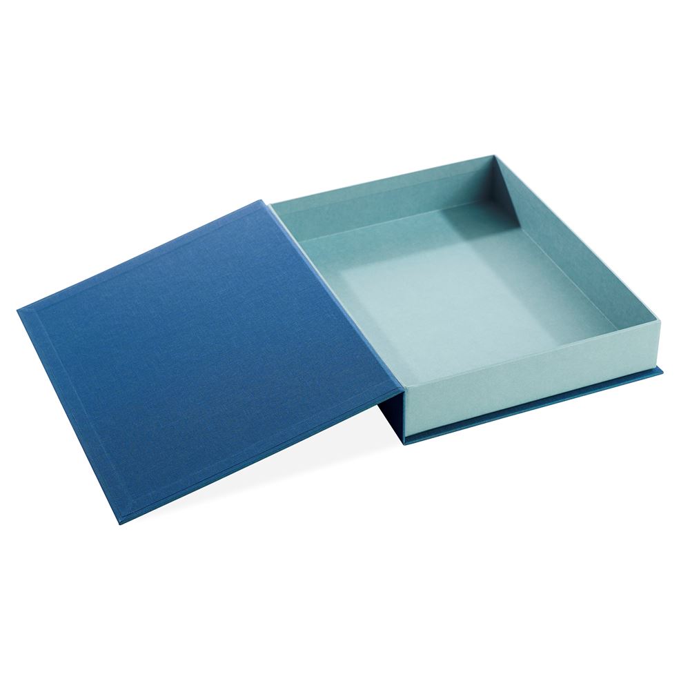 A very chic and sturdy storage box that opens like a book and like a (really nice hard- backed) book it is covered with high-quality bookbinder's cloth. The sides and interior are covered with a lovely, matching, durable paper. A pleasure to behold and one that will bring style and organisation to your desk, home office etc...