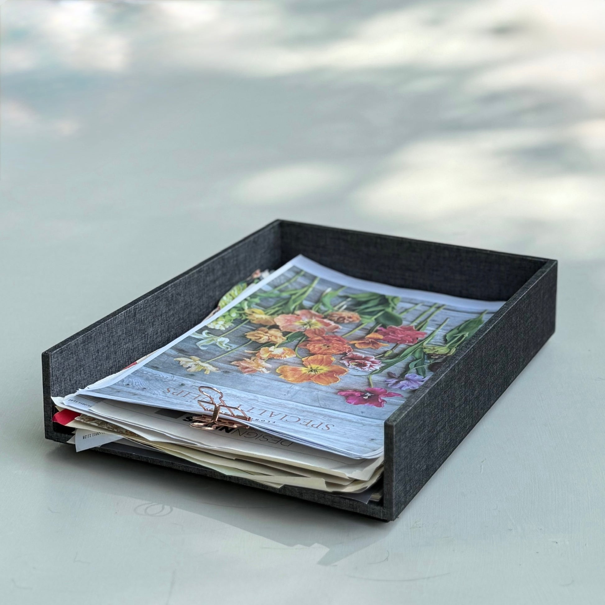 Turn a chaotic desk into a haven of organisation and style with these Swedish, stackable letter trays. They are made of MDF and are covered in classic bookbinding cloth so they stack beautifully and are properly sturdy. Stick to one colour or mix it up with the other colours we sell ( good for distinguishing in/out post, bills, billets doux etc..) however you choose to do it they will look as chic as they are functional.