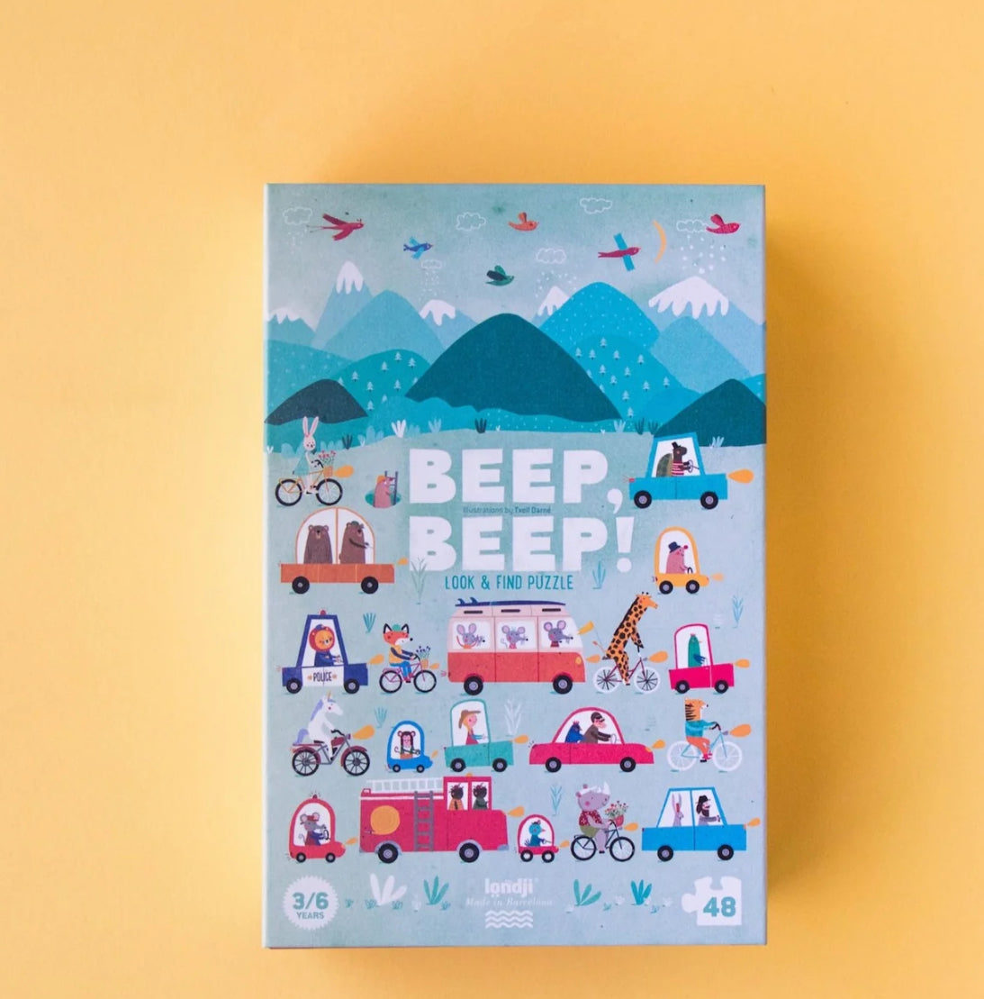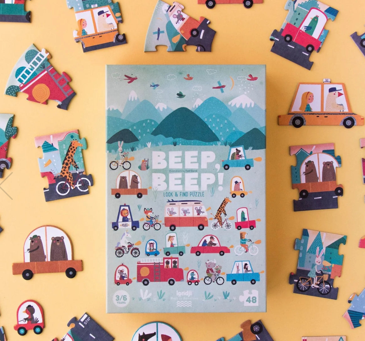 This Beep Beep puzzle includes 48 pieces and 10 car shapes. Spot drivers, happy cyclists and trucks loaded with ice cream. May the route never end!