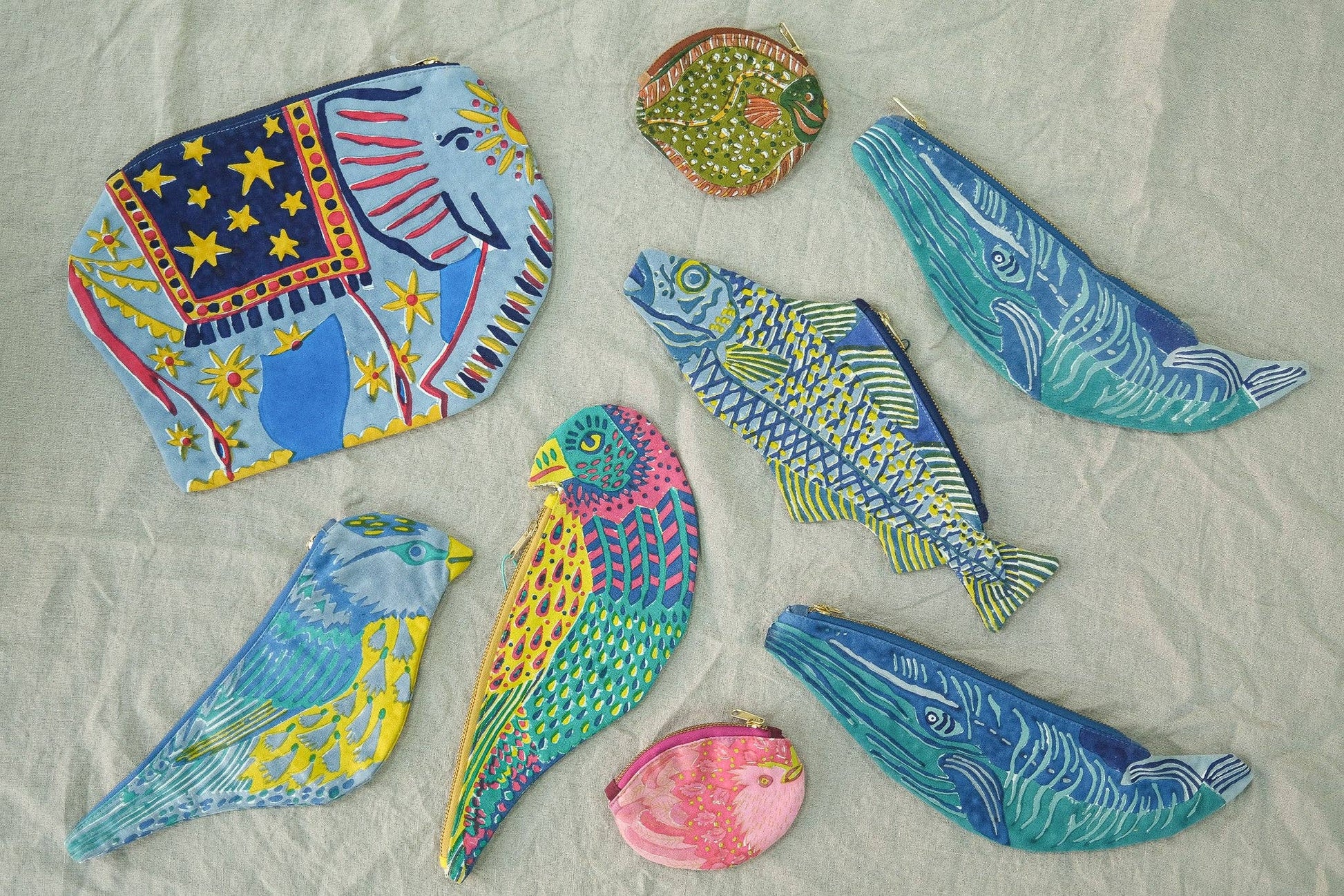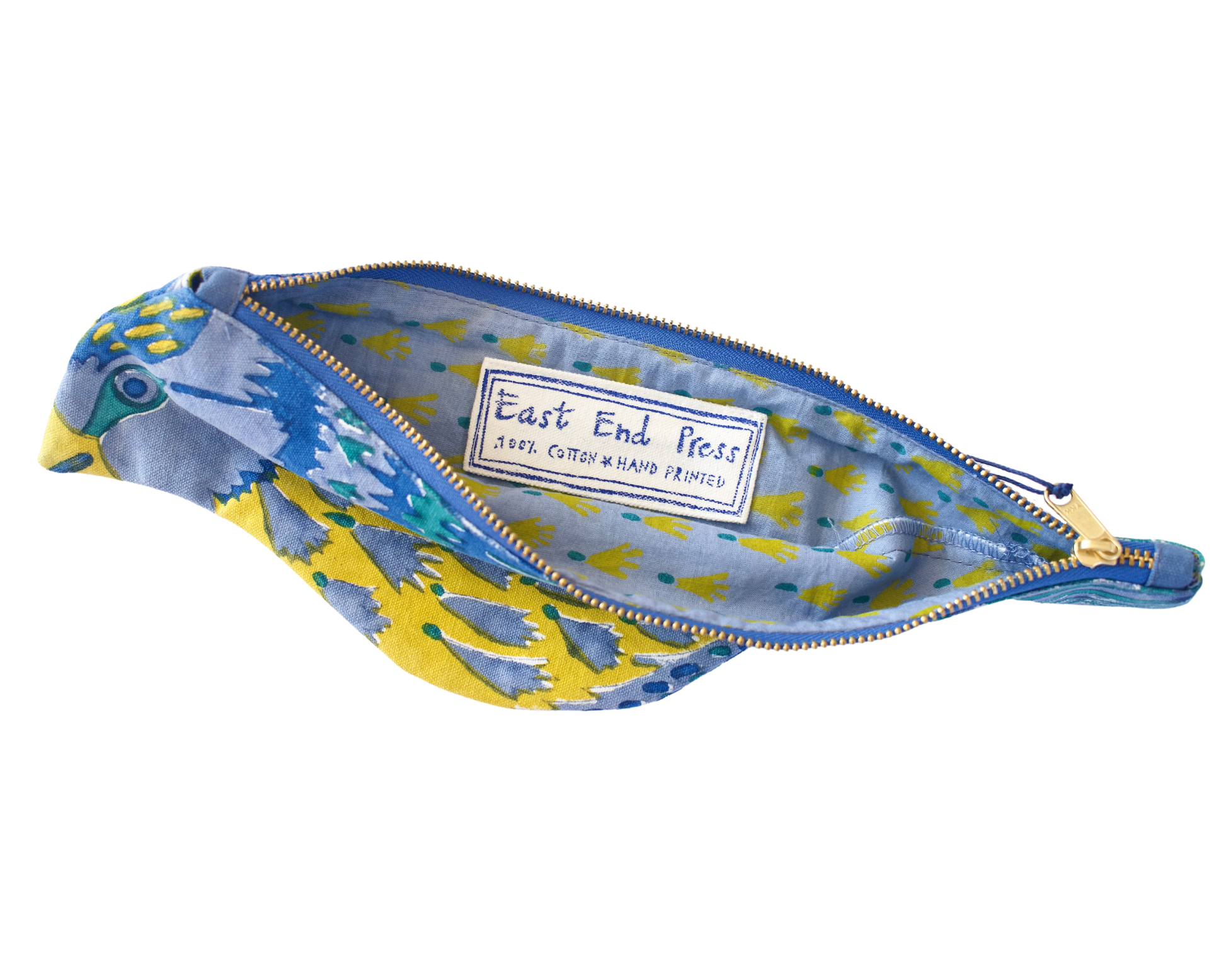 This colourful bird pouch is ideal for all your bits and bobs or pencils and paintbrushes. The bird is entirely printed by hand using carved wooden blocks and has a complementing patterned lining. The bird is beautifully made from 100% cotton with a strong brass zip.