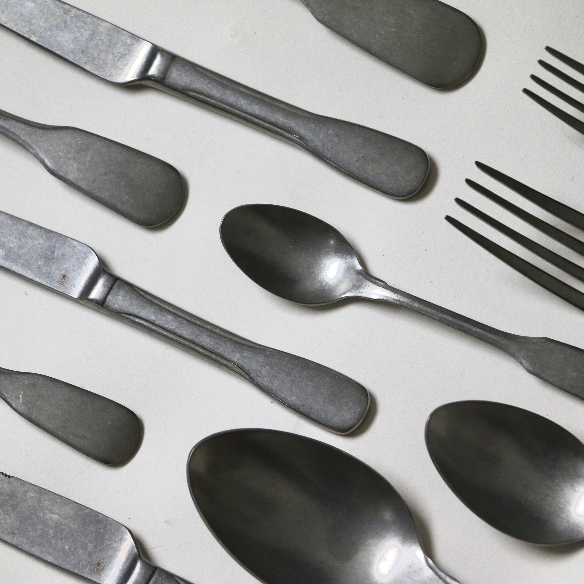 This superb brilliant range is made of stainless steel but has the patina of age achieved by a finishing process where each piece is tumbled with porcelain stones.