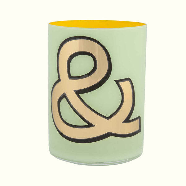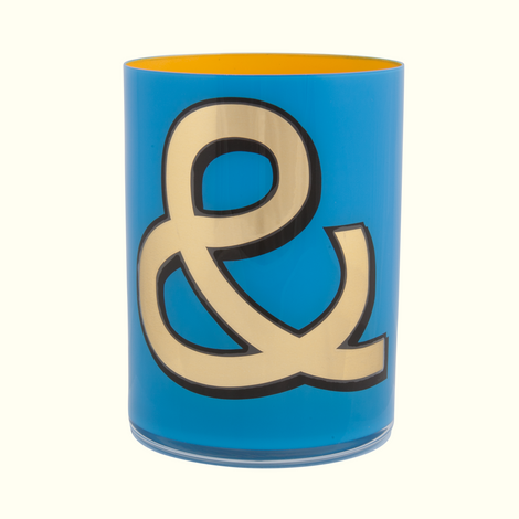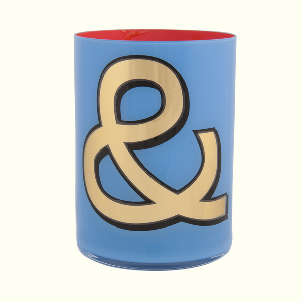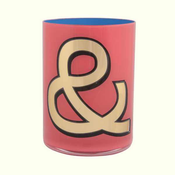 Smooth glass tumblers inlaid with a gold vinyl letter or symbol, backed with a different coloured lacquer and a topcoat of glossy varnish.