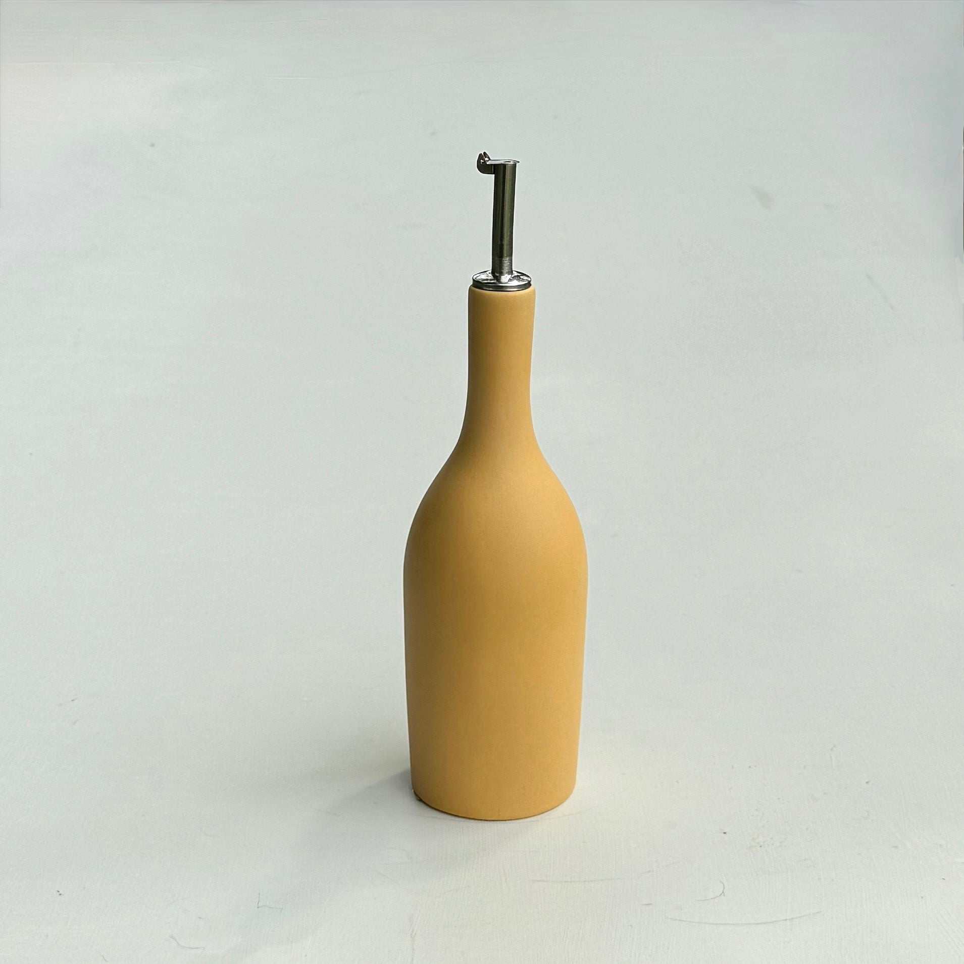 Perfect-imperfect ceramic olive oil bottle in a soft ochre yellow with metal pourer.