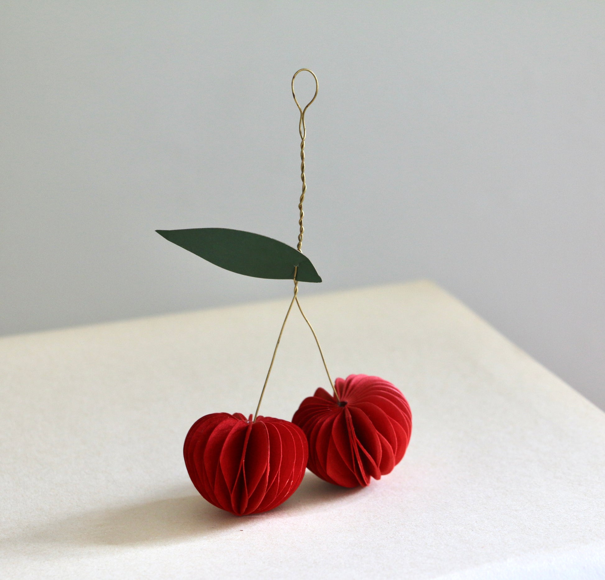 This bunch of two red cherries is made from carefully folded paper cherries affixed to a metal hanging loop. Whether hung from a branch or used as part of a seasonal centrepiece, the intricate paper decoration adds a touch of colourful whimsy to any setting.