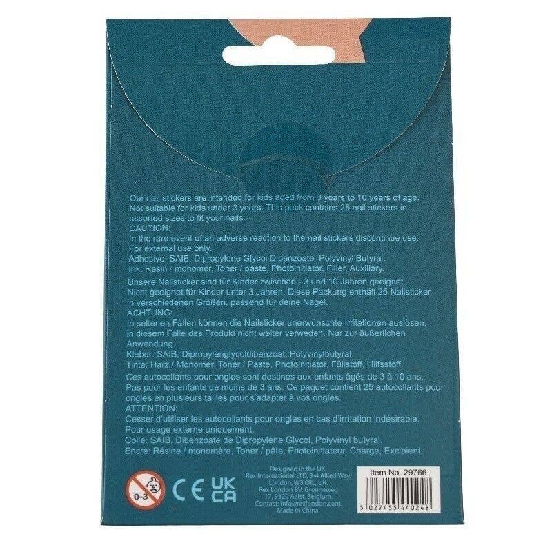 Includes five sets of stickers of differing sizes to fit each of the average child's fingernails on one hand. • Intended for children from 3-10 years old • Not suitable for children under 3 years old (choking hazard) • In the rare event of an adverse reaction to the nail stickers, discontinue use immediately. • For external use only. • Adhesive ingredients: SAIB, dipropylene glycol dibenzoate, polyvinyl butyral • Ink ingredients: resin/monomer, toner/paste, photoinitiator, filler, auxiliary