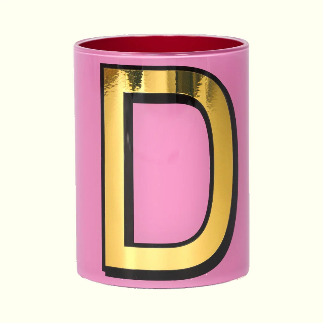 Smooth glass tumblers inlaid with a gold vinyl letter or symbol, backed with a different coloured lacquer and a topcoat of glossy varnish.