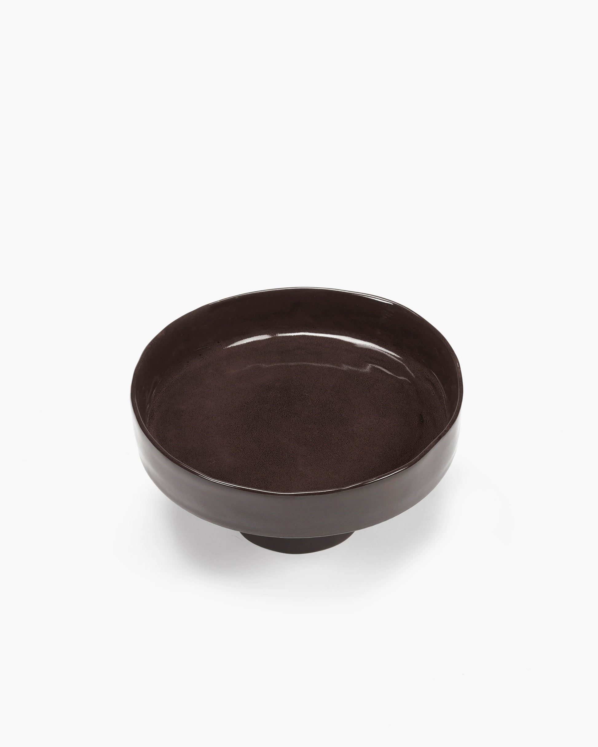 These deep raised stoneware plates are both functional and beautiful thanks to the artisanal approach and characterful materials which designer Marie Michielssen chose to use. These plates, which have been finished with a warm dark brown, almost black glaze, are part of the La Mère collection.