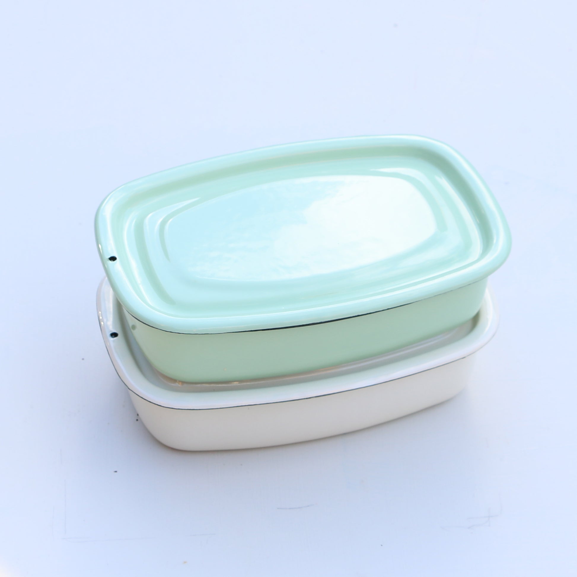 The triple coated vitreous enamel is fired in traditional kilns, onto a heavy steel base. It goes without saying they are perfect in a kitchen but they work well in bathrooms too for storing small items