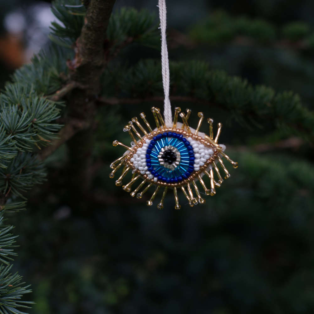 You are being watched. These hand-made, beaded eyes are just brilliant. Available with a grey, blue or green iris (all excellent) they make a popular year round ornament.
