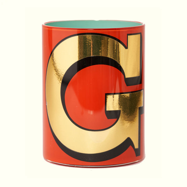 Smooth glass tumblers inlaid with a gold vinyl letter or symbol, backed with a different coloured lacquer and a topcoat of glossy varnish.