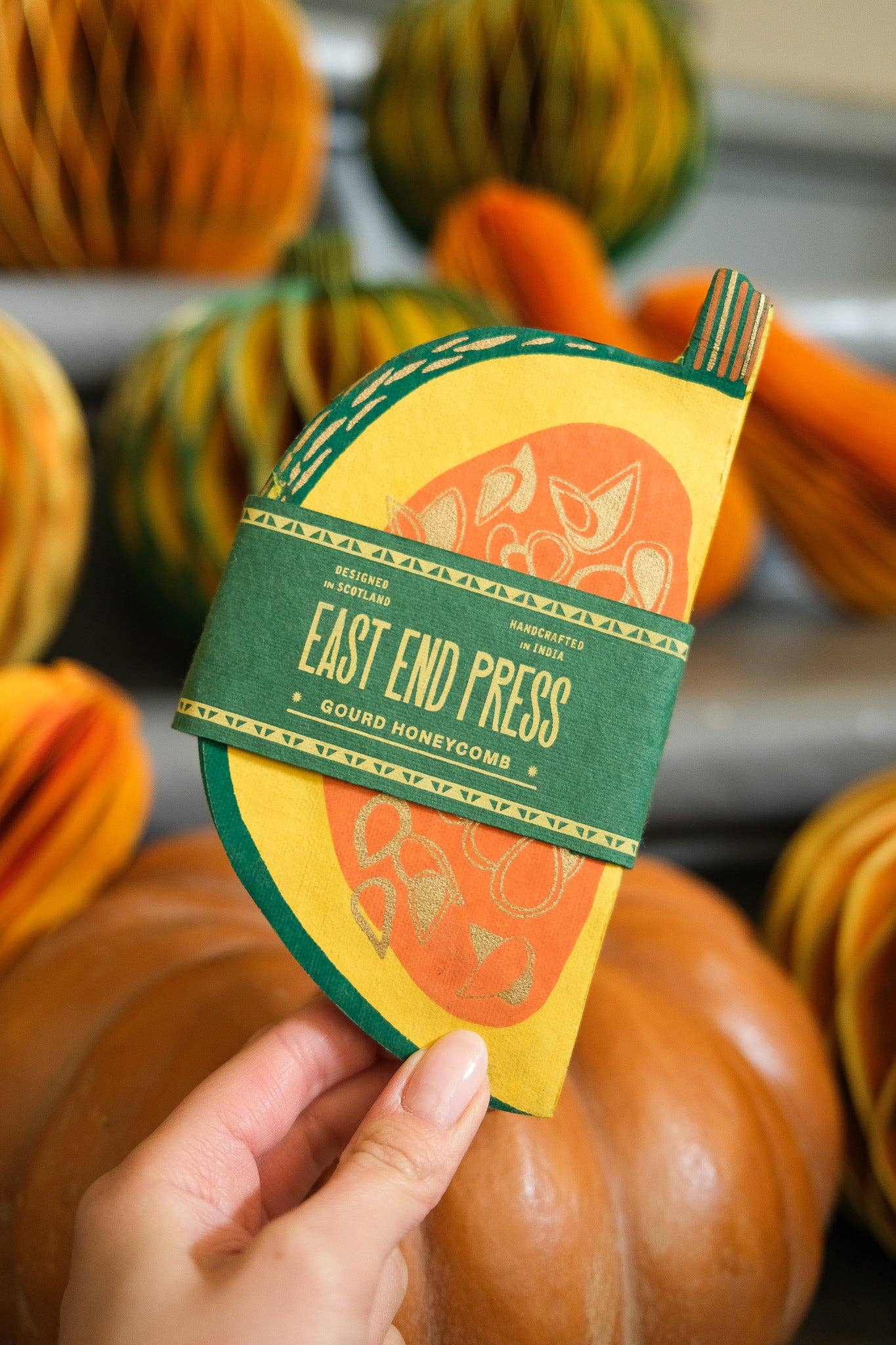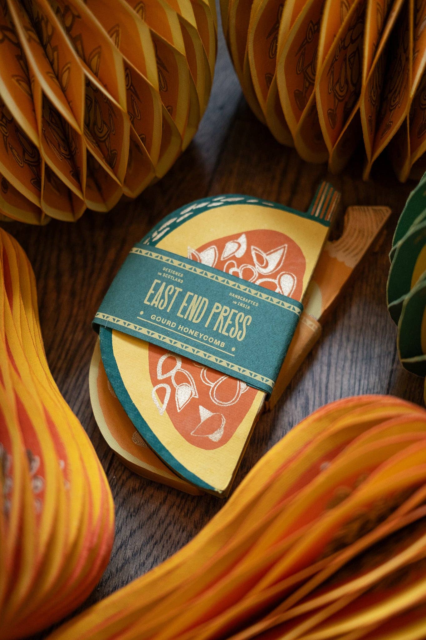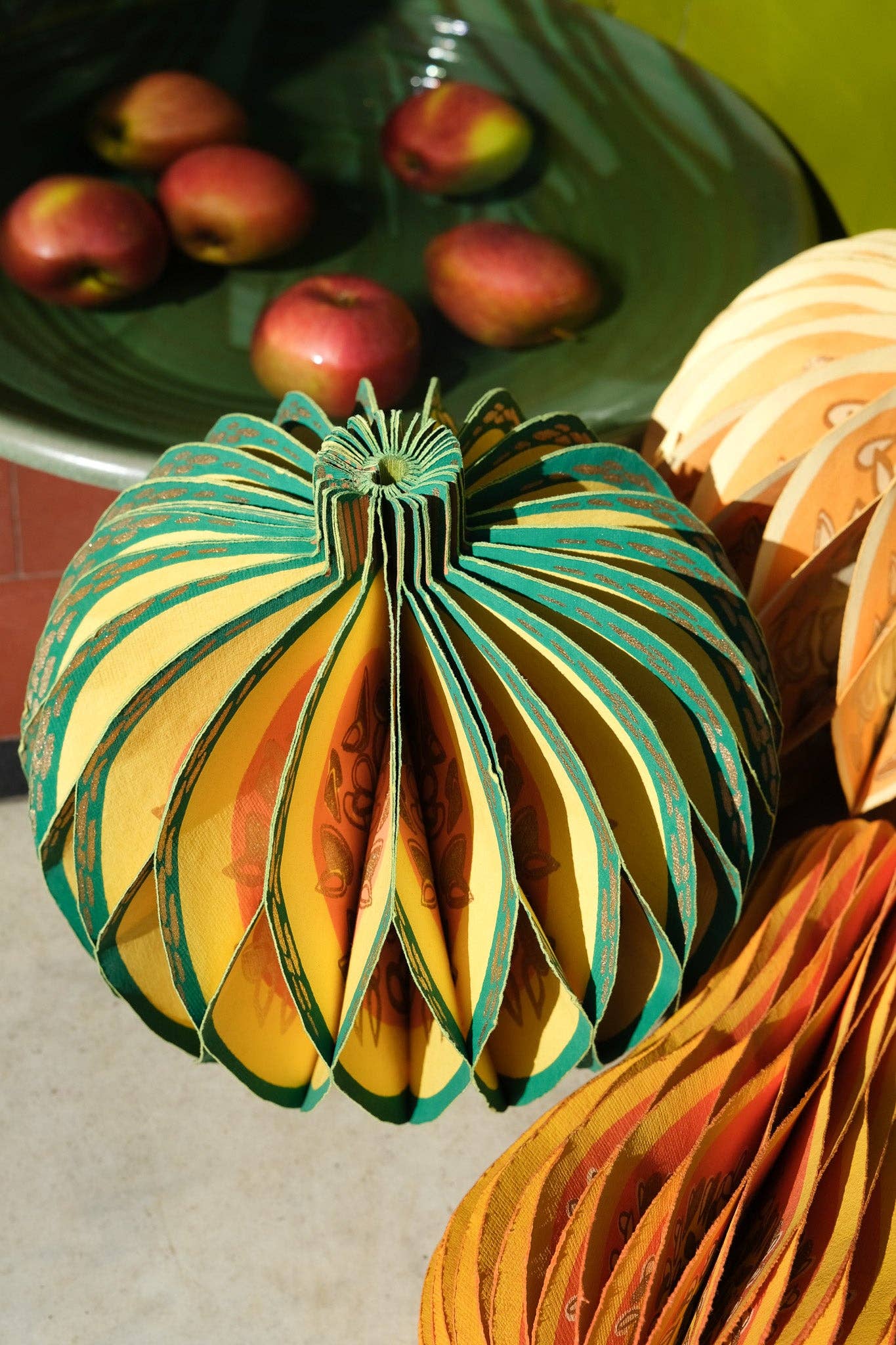 Composed of intricate layers of recycled cotton paper, each decoration unfolds to reveal a three-dimensional gourd honeycomb. - One gourd-shaped paper ornament with a cotton hanging loop - Each secured with a magnet - Screen printed by hand by talented artisans in Jaipur - Sustainably made from recycled materials