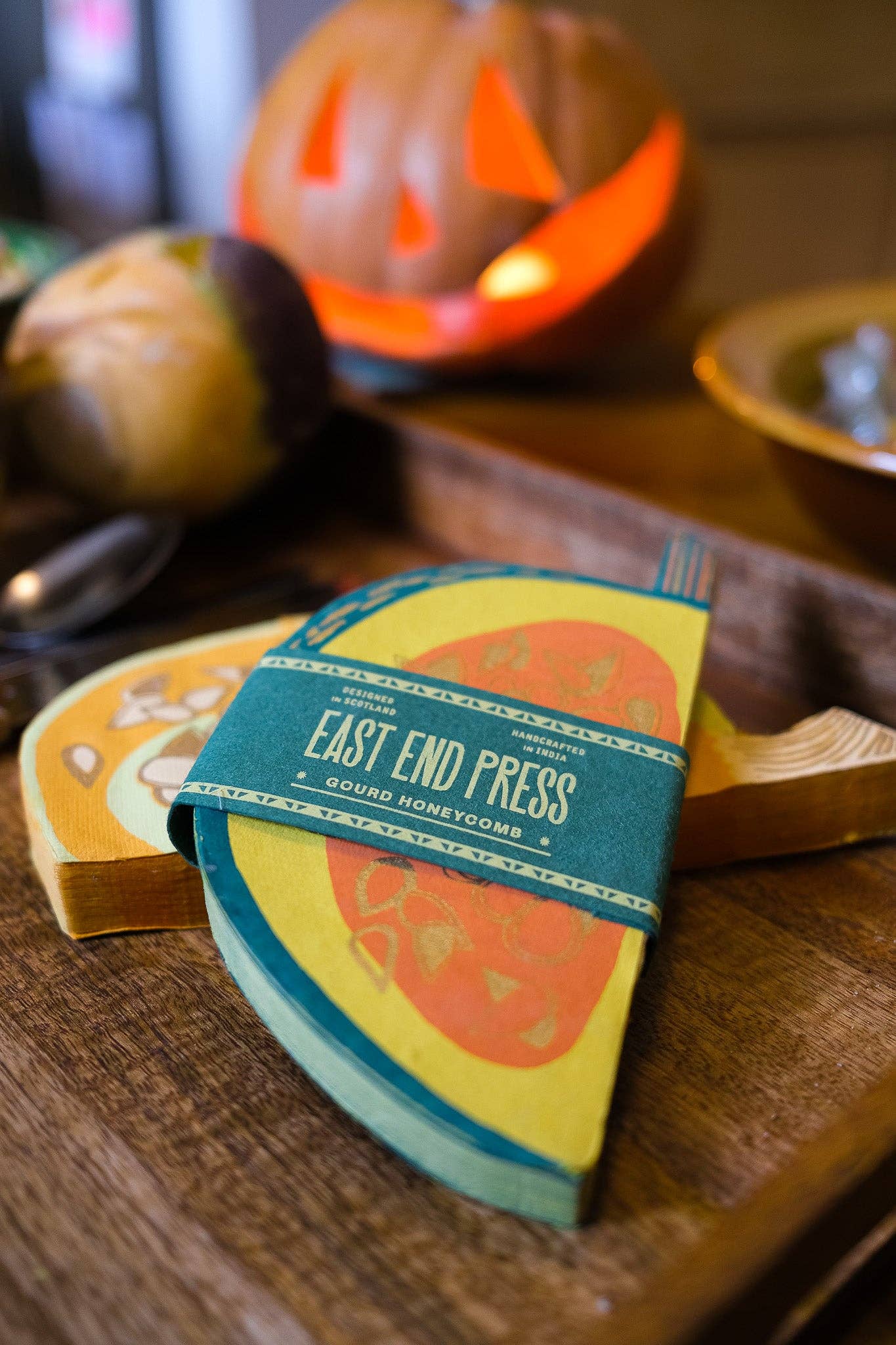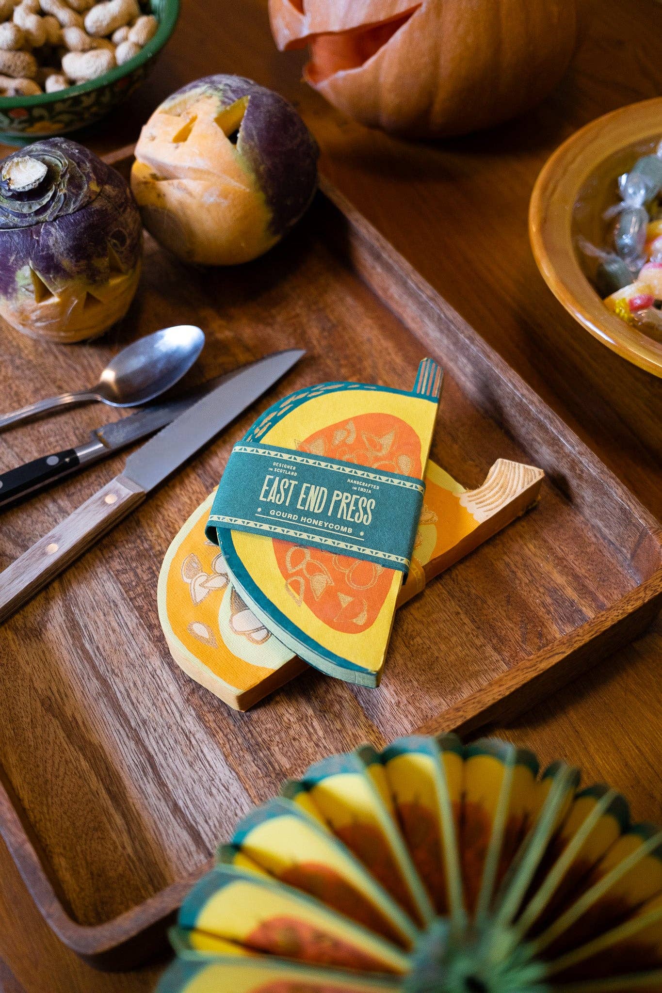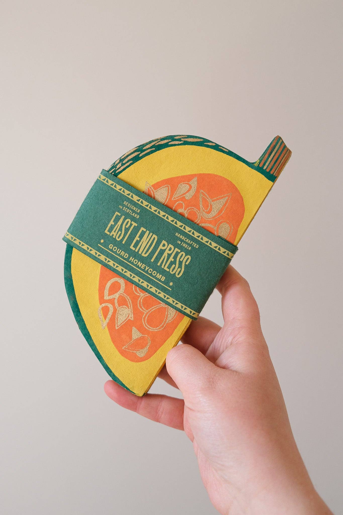 Composed of intricate layers of recycled cotton paper, each decoration unfolds to reveal a three-dimensional gourd honeycomb. - One gourd-shaped paper ornament with a cotton hanging loop - Each secured with a magnet - Screen printed by hand by talented artisans in Jaipur - Sustainably made from recycled materials