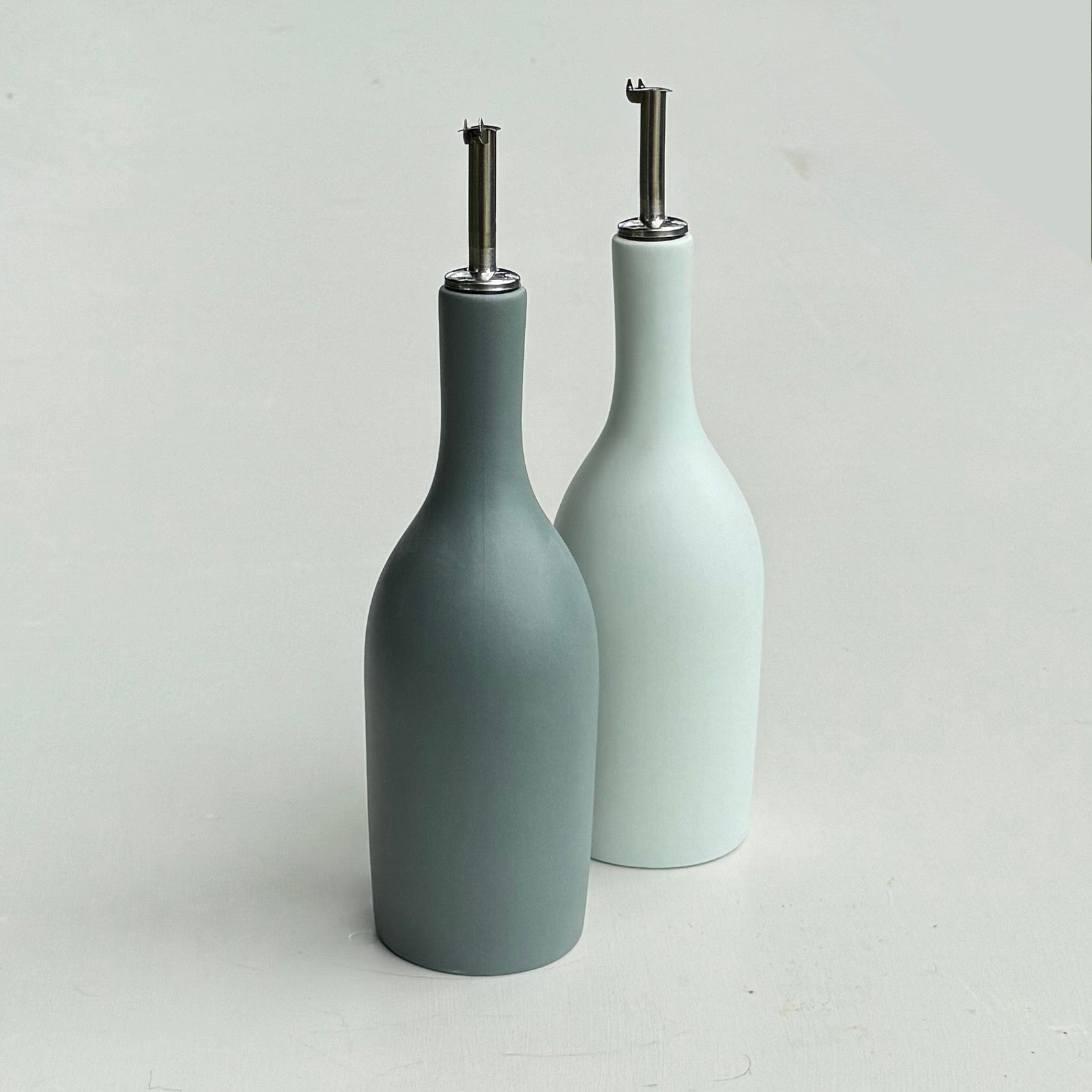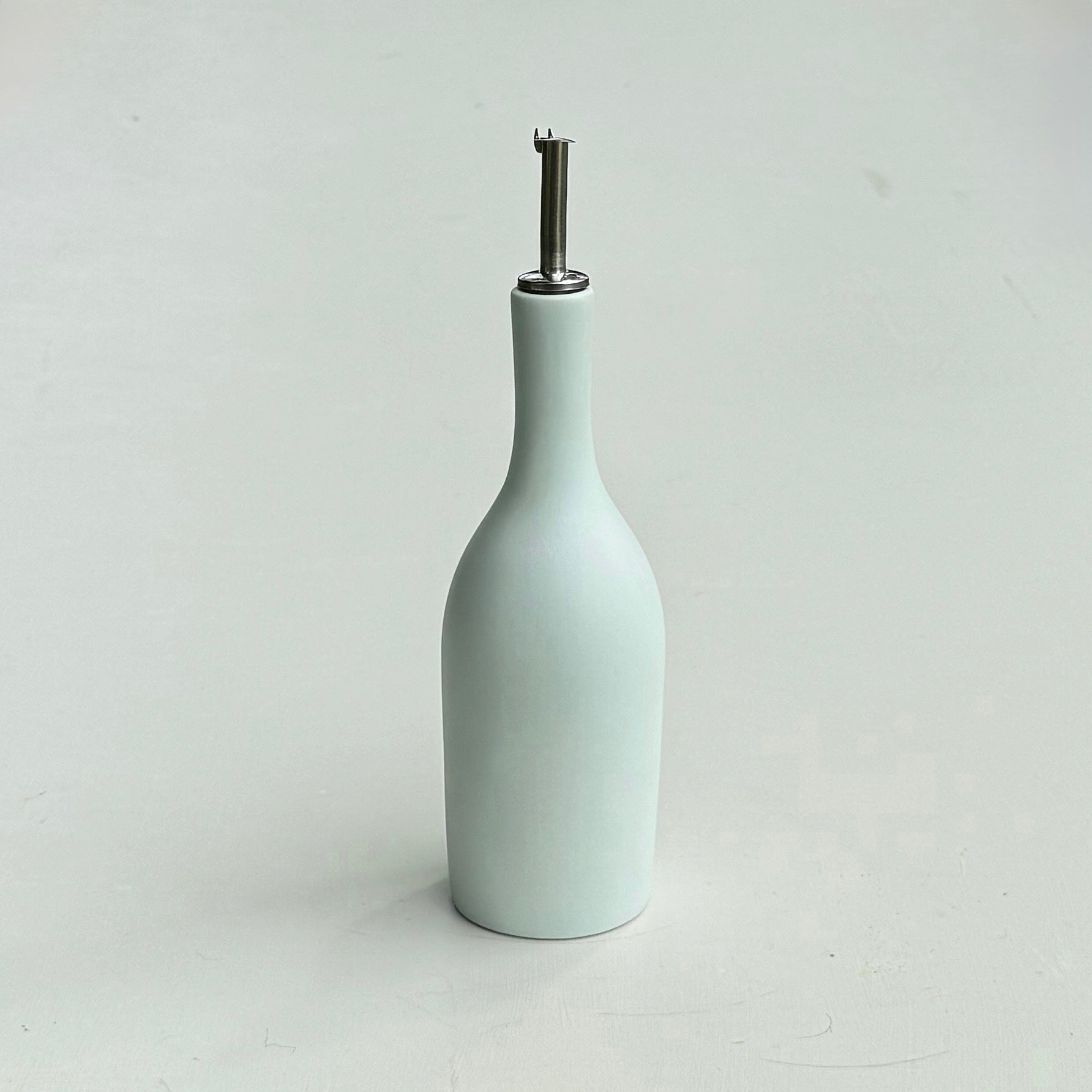 Perfect-imperfect ceramic olive oil bottle in a powdery baby blue - almost white. It also comes with a metal stopper and pourer.
