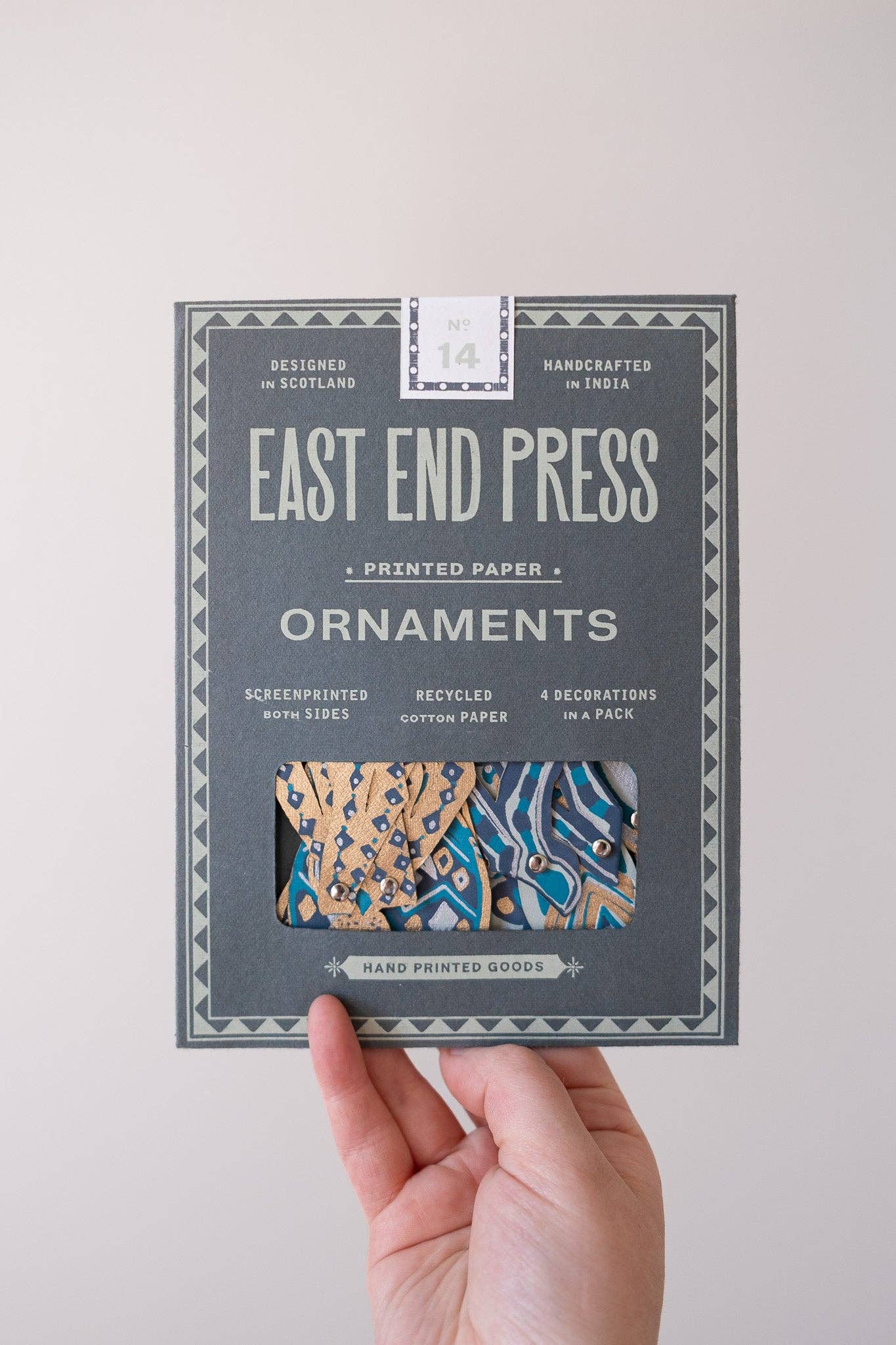 A set of 4 illustrated paper decorations with cotton 10cm hanging loop - Adjustable legs with split rivets - Screen printed by hand on both sides by talented artisans in Jaipur - Sustainably made from recycled materials Disclaimer: this item is not a toy, and contains small components not suitable for children.
