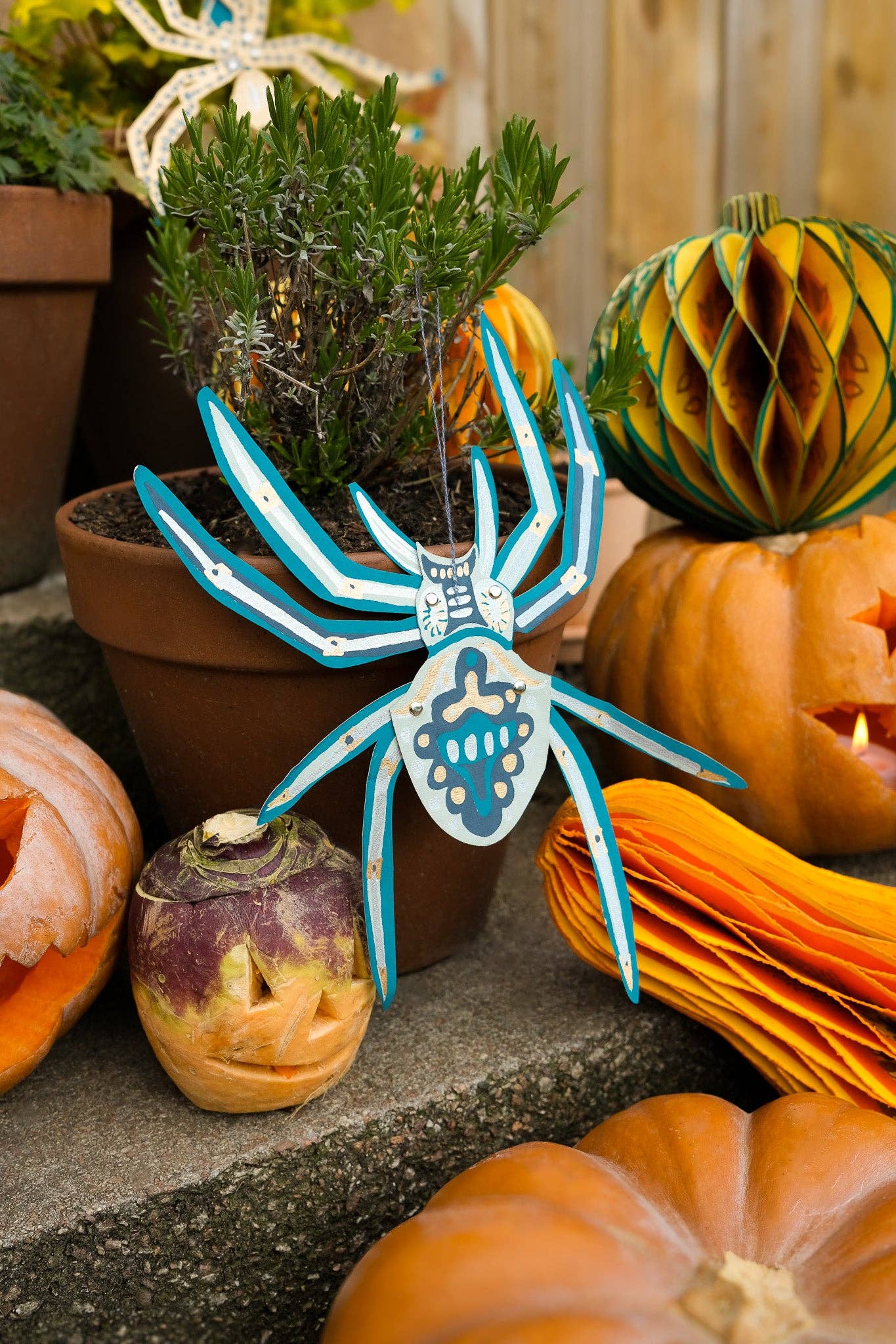 Includes four individual paper spiders each with adjustable legs, ready to hang up and decorate your home for Halloween! Each ornament features a different design and is designed to fold out creating a three-dimensional paper shape with a cotton hanging loop.