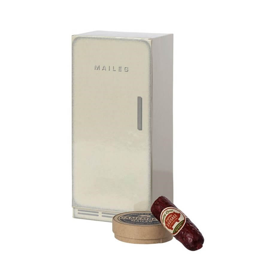 The Maileg Cooler is the perfect grocery storage for your mouse friends, featuring two shelves stocked with a tiny sausage and cheese.