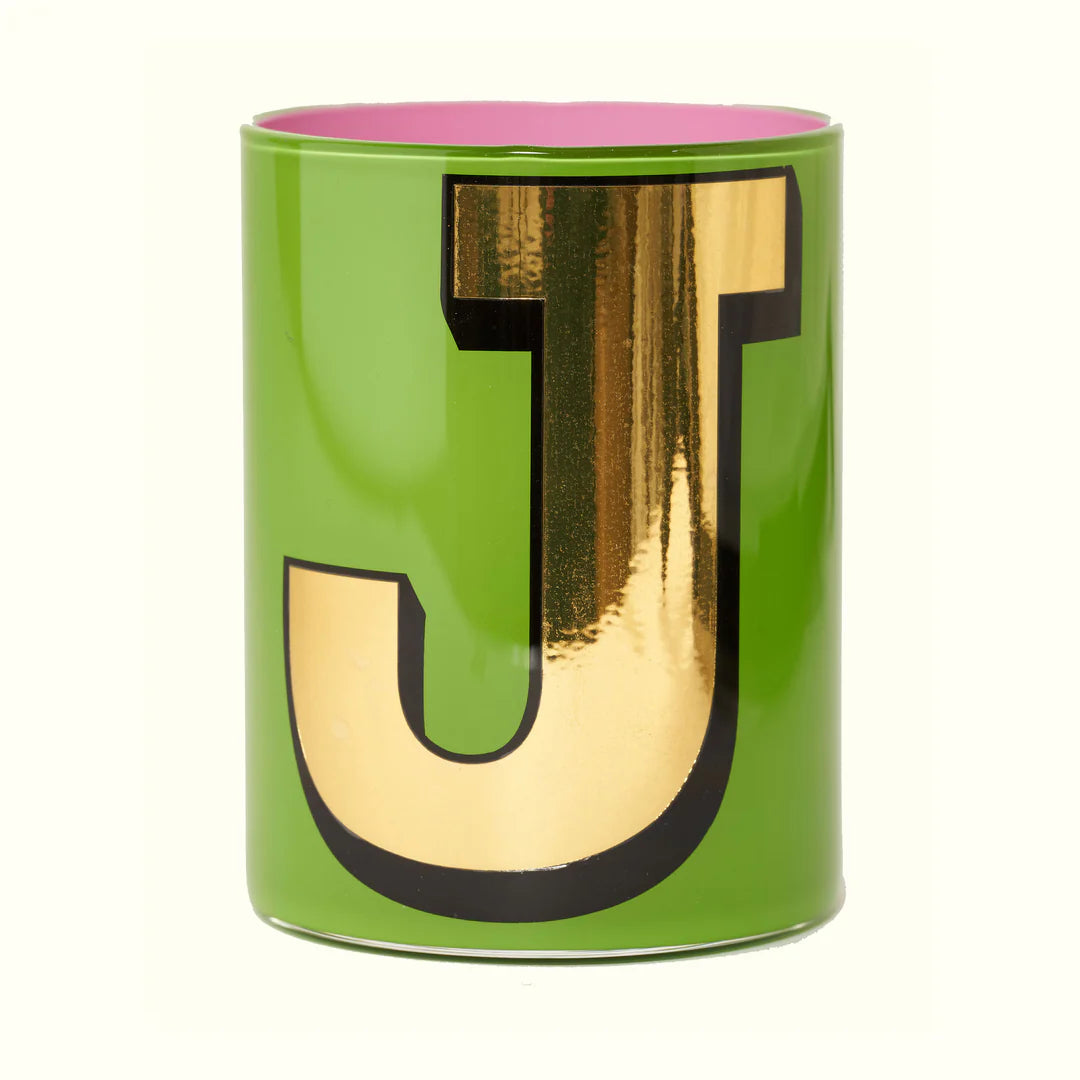 Smooth glass tumblers inlaid with a gold vinyl letter or symbol, backed with a different coloured lacquer and a topcoat of glossy varnish.