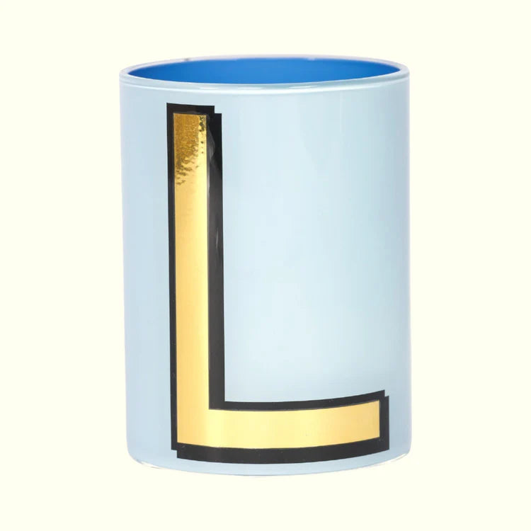 Smooth glass tumblers inlaid with a gold vinyl letter or symbol, backed with a different coloured lacquer and a topcoat of glossy varnish.
