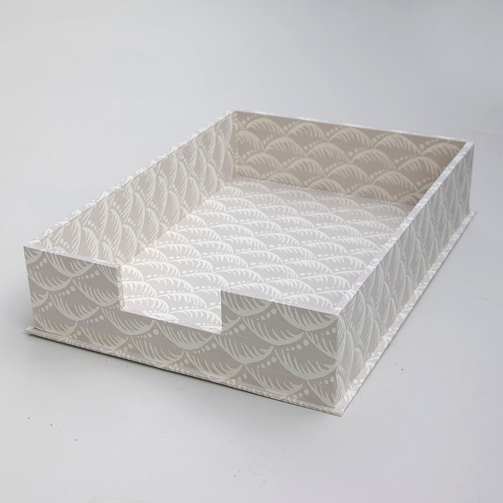 These beautiful, strong and highly decorative A4 letter trays are a sophisticated and elegant addition to any desk. They are perfect for storing miscellaneous papers, photographs, postcards, invitations etc..They are very strong and unlike most letter trays, stack without collapsing on each other! They are hand-made in England from high quality rigid board and wood, with a flanged base and a cut out at one end. They are lined inside and out in gorgeous patterned paper. We use different coloured and patterned ones in our office as an easy way to identify post in, out, bills etc.. effective and so pretty!