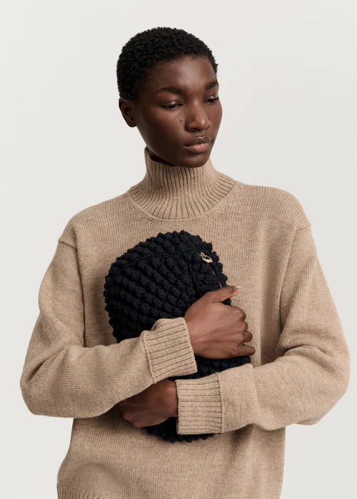 A spacious, hand-knitted clutch made from heavy highland wool. The bag is lined with practical details such as an interior pocket and zip closures. Designed with a beautiful mega pearl pattern that adds a distinctive touch.
