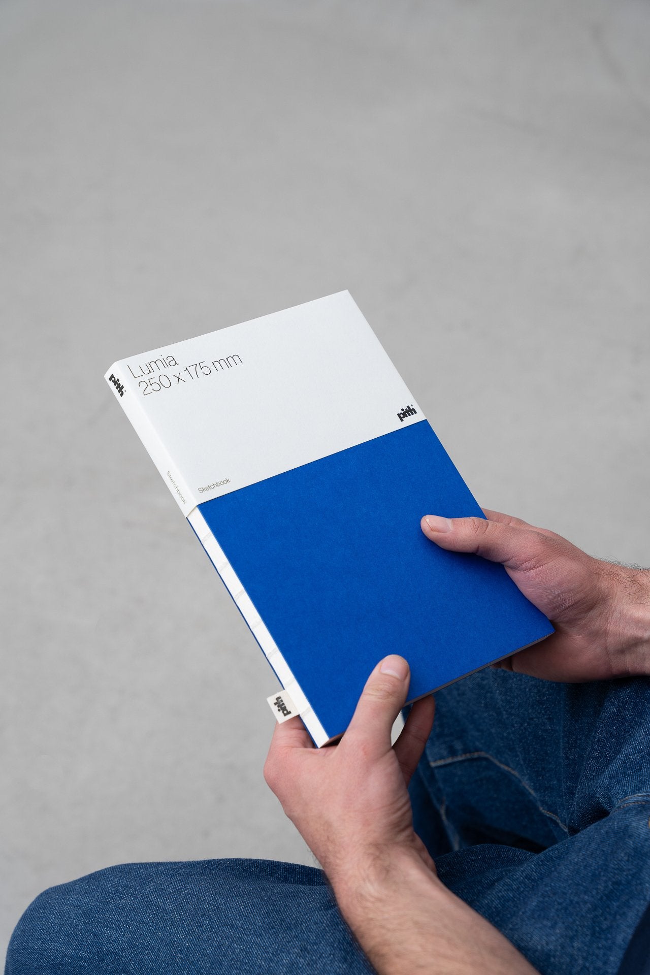 The Lumia Sketchbook features 76 pages of sustainable 200 gsm ivory paper. Exposed binding offers a minimal aesthetic while allowing the book to open completely flat on every page. Perfect for wet and dry media, including light watercolour. Hand-finished with a 1.5 mm recycled board cover, available in black, raw, lavender, chartreuse and chalk.