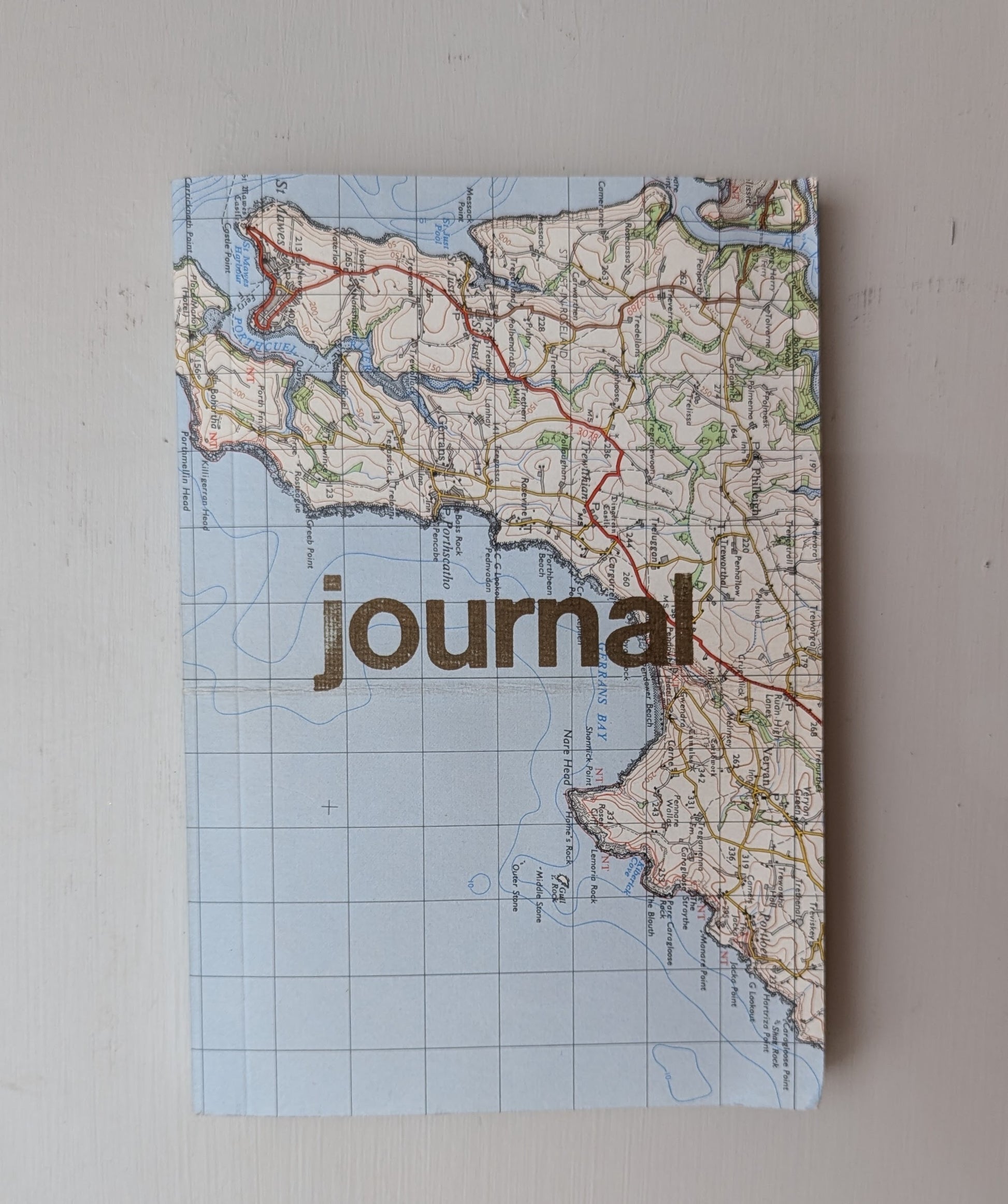 A beautiful hand printed Journal with a cover made from vintage linen maps dating back to the 1960's, each cover is unique and may show some markings reflected in its age. The outside of this Journal is the map, with 'Journal' printed in gold letterpress, the reverse is the linen backing.