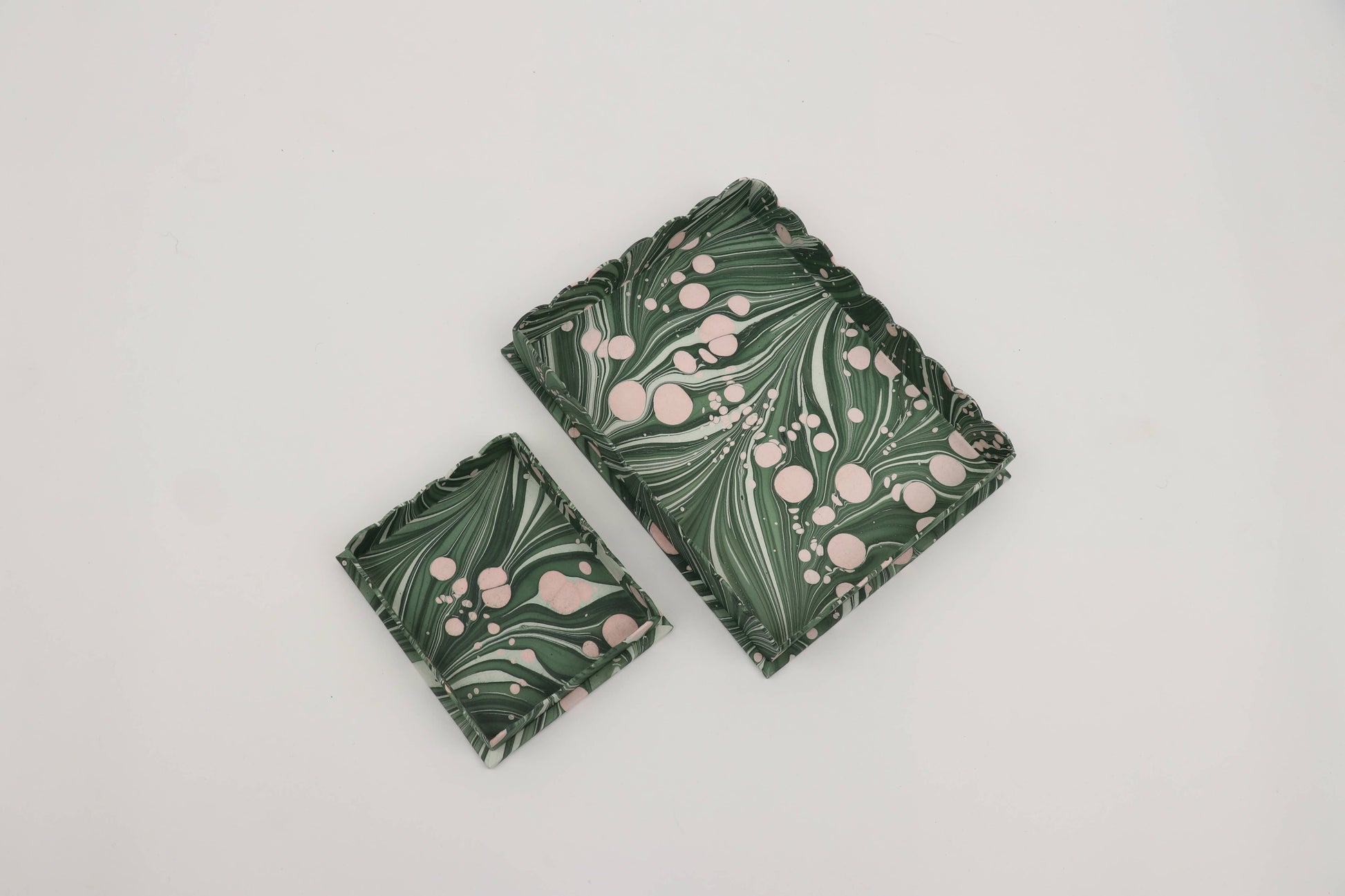 Recycled Cotton Handmade Paper Tray Sets are made by Master Artisans who have been creating vintage style boxes and cartonage products for generations in Jaipur. The Paper design is Hand Marbled. Produced in Small Batches only. Designed to Inspire a home filled with Artisanal Slow Living Objects. Set of Nested Small and Large Tray