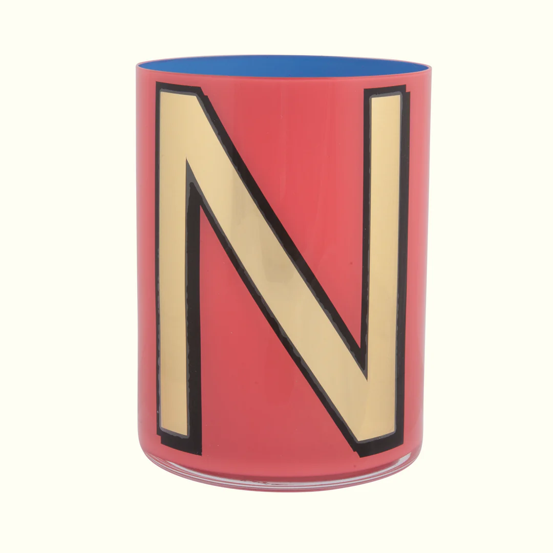 Smooth glass tumblers inlaid with a gold vinyl letter or symbol, backed with a different coloured lacquer and a topcoat of glossy varnish.