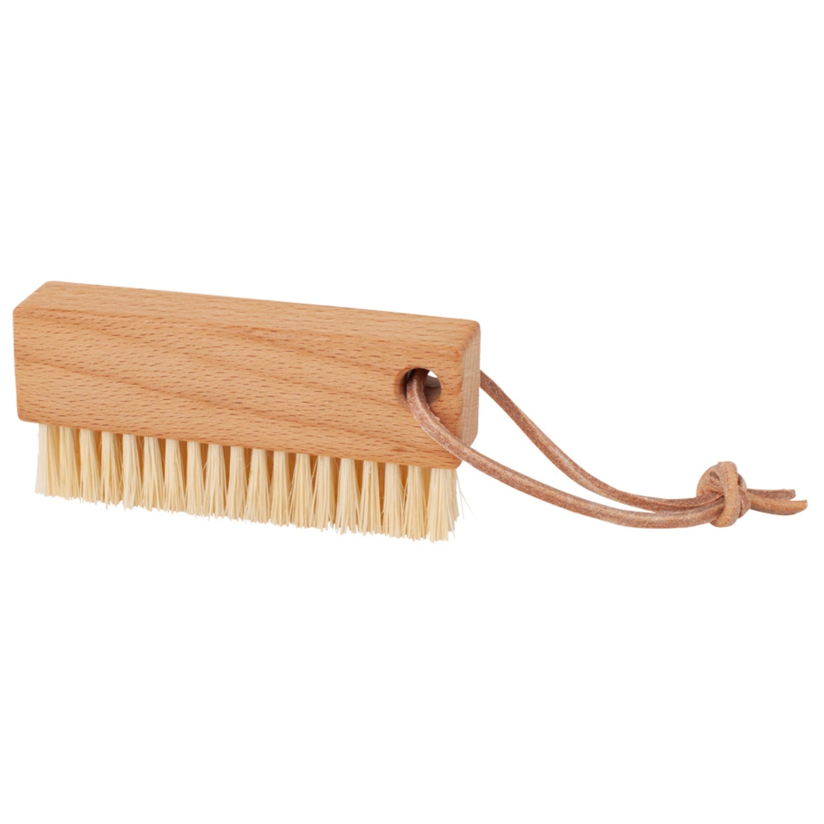 An elongated squared off shape, hand crafted from oiled beechwood and set with stiff bristles for general scrubbing of hands and nails. Beautifully designed with a leather loop for hanging, this is a particularly fine nailbrush which will deliver many years of faithful service. Measures 9.5cm long x 1.9cm wide.