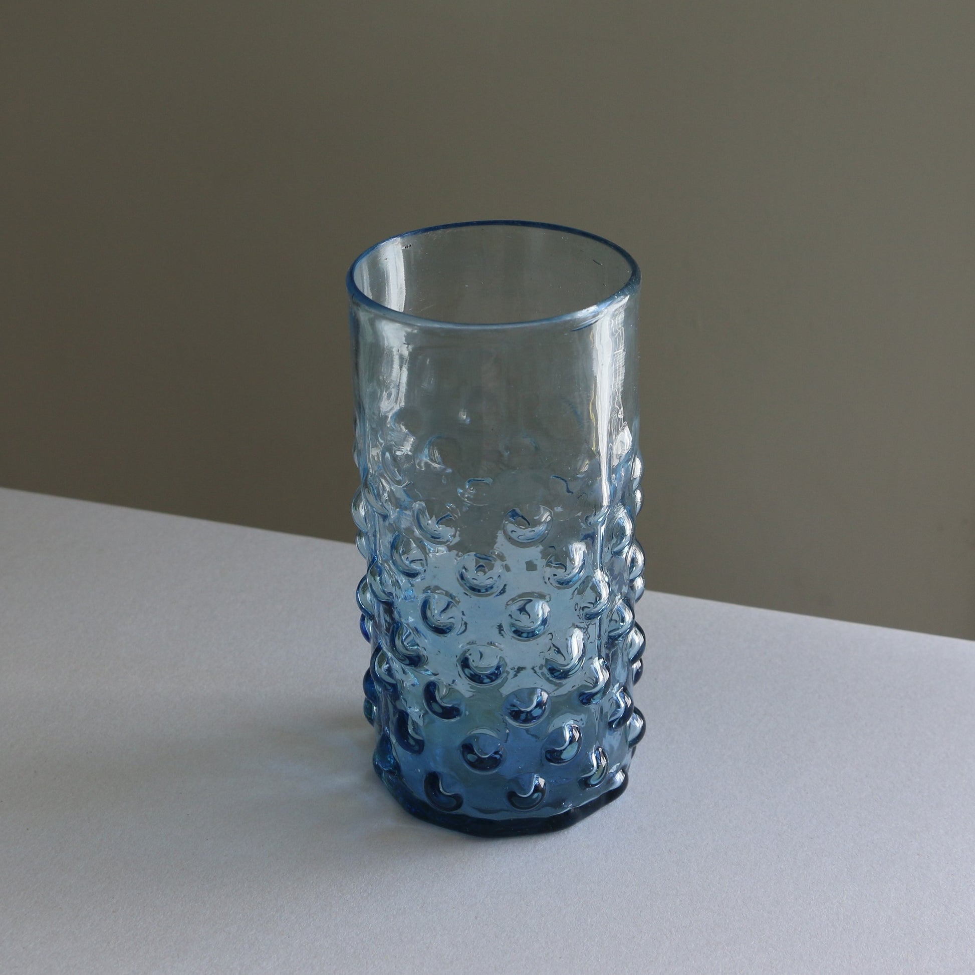 SALAHEDDIN is a fair-trade company importing glassware made by Syrian Craftspeople. The recycled glass is dyed in batches and then mouth blown. Each piece is entirely individual, and the (sometimes quite noticeable) variation in size with bubbles and streaks of colour add to its unique beauty.