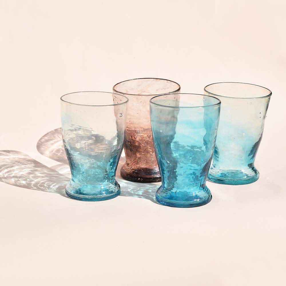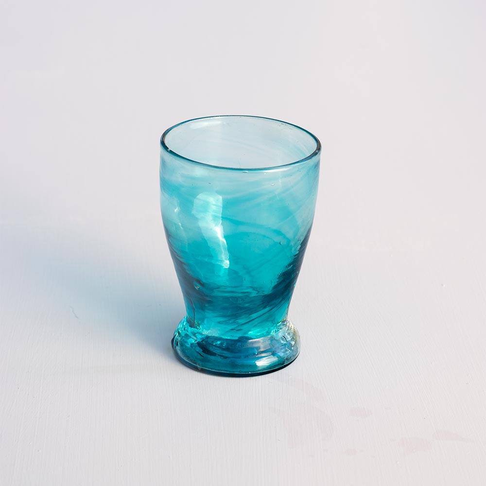 SALAHEDDIN is a fair-trade company importing glassware made by Syrian Craftspeople. The recycled glass is dyed in batches and then mouth blown. Each piece is entirely individual, and the (sometimes quite noticeable) variation in size with bubbles and streaks of colour add to its unique beauty.