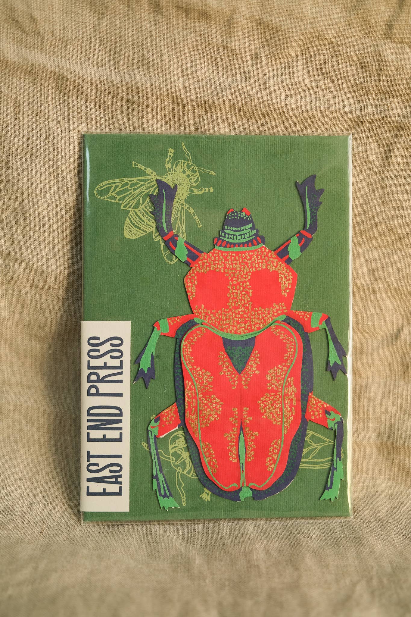 Our best selling bug design, this scarab beetle has gold details and rich jewel tones. Underneath the beetle's wings is a panel for your message.