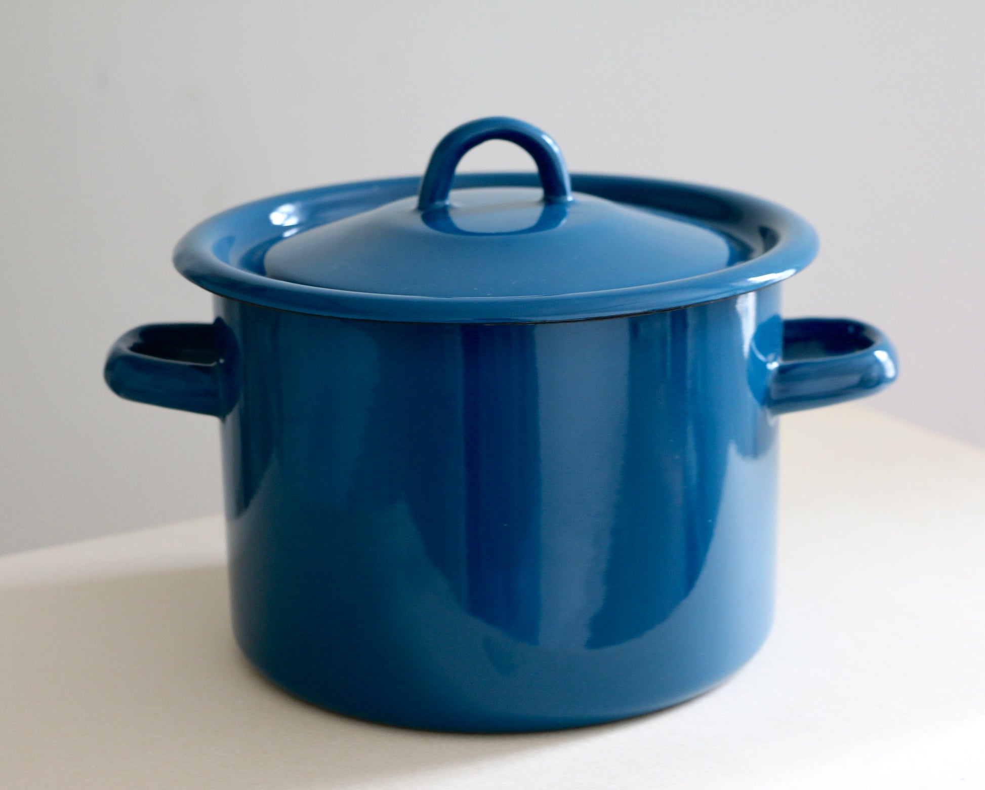 They are fired in traditional kilns are triple coated with a heavy steel base. Sturdy and useful they are a great size for cooking, but also look lovely on a counter as a bread bin or massive cookie jar!