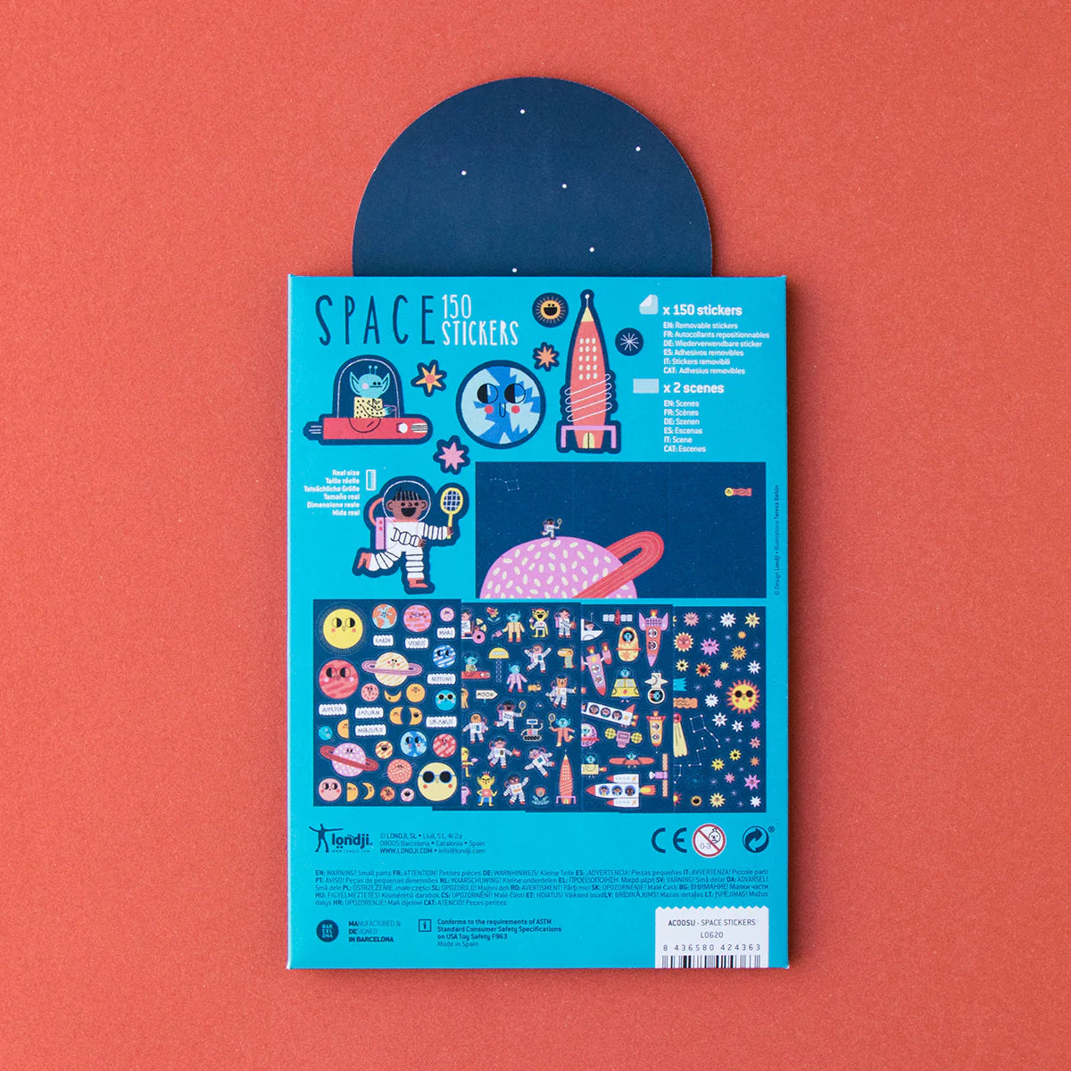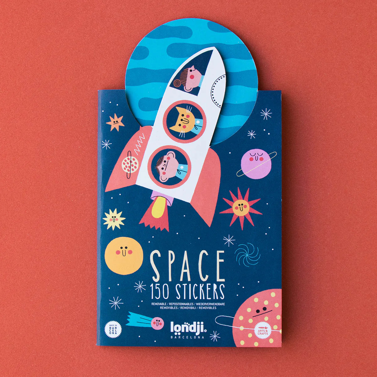 We are big fans of the removable sticker, no anxiety over a poor positioning moment, or of using up your absolute favourite sticker. This set has a folder which doubles as a background for 150 removable space vehicle stickers with different characters, satellites, planets, constellations and stars of all kinds. Build your favourite sky on the scene of your choice!