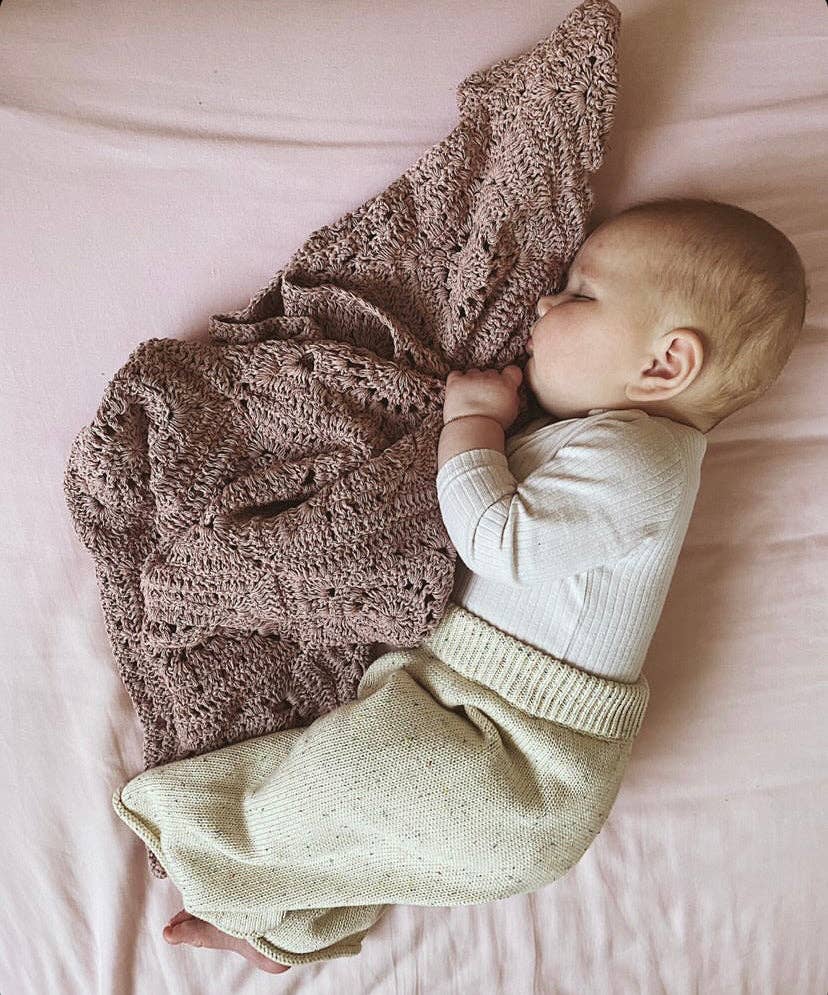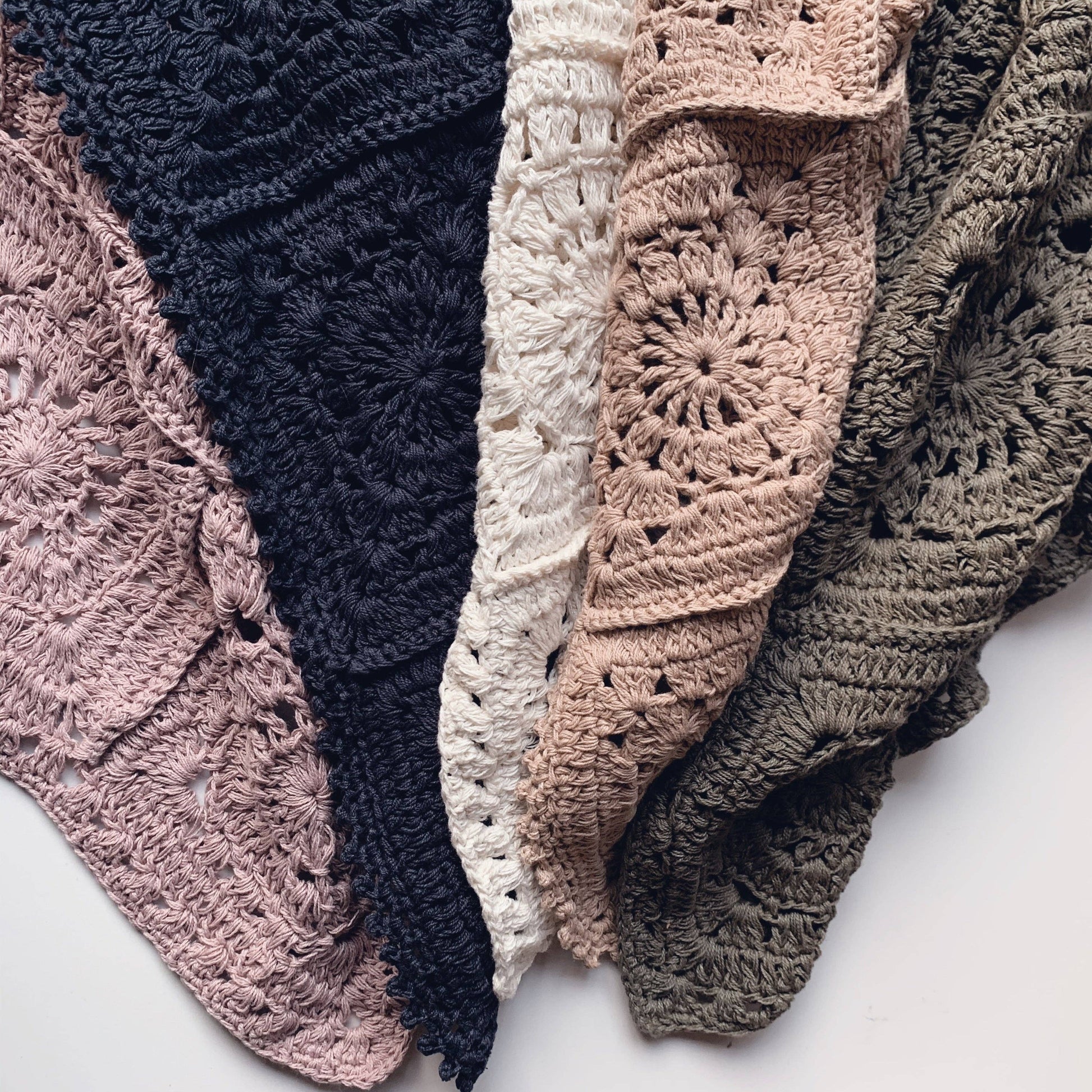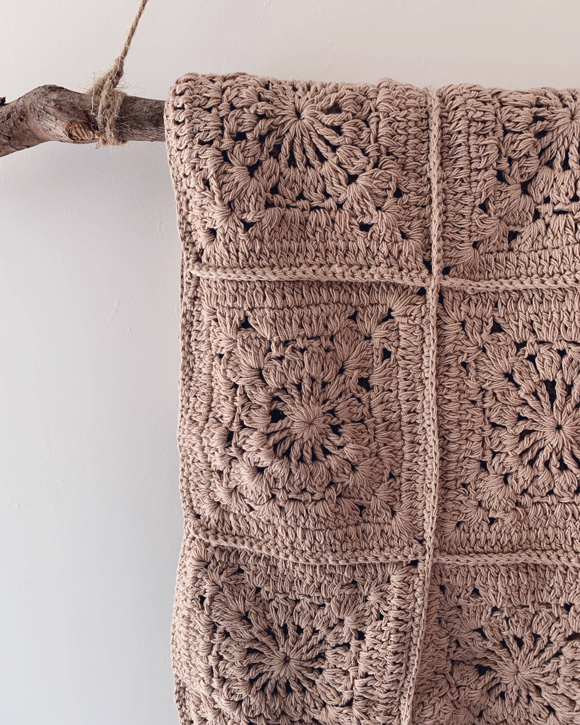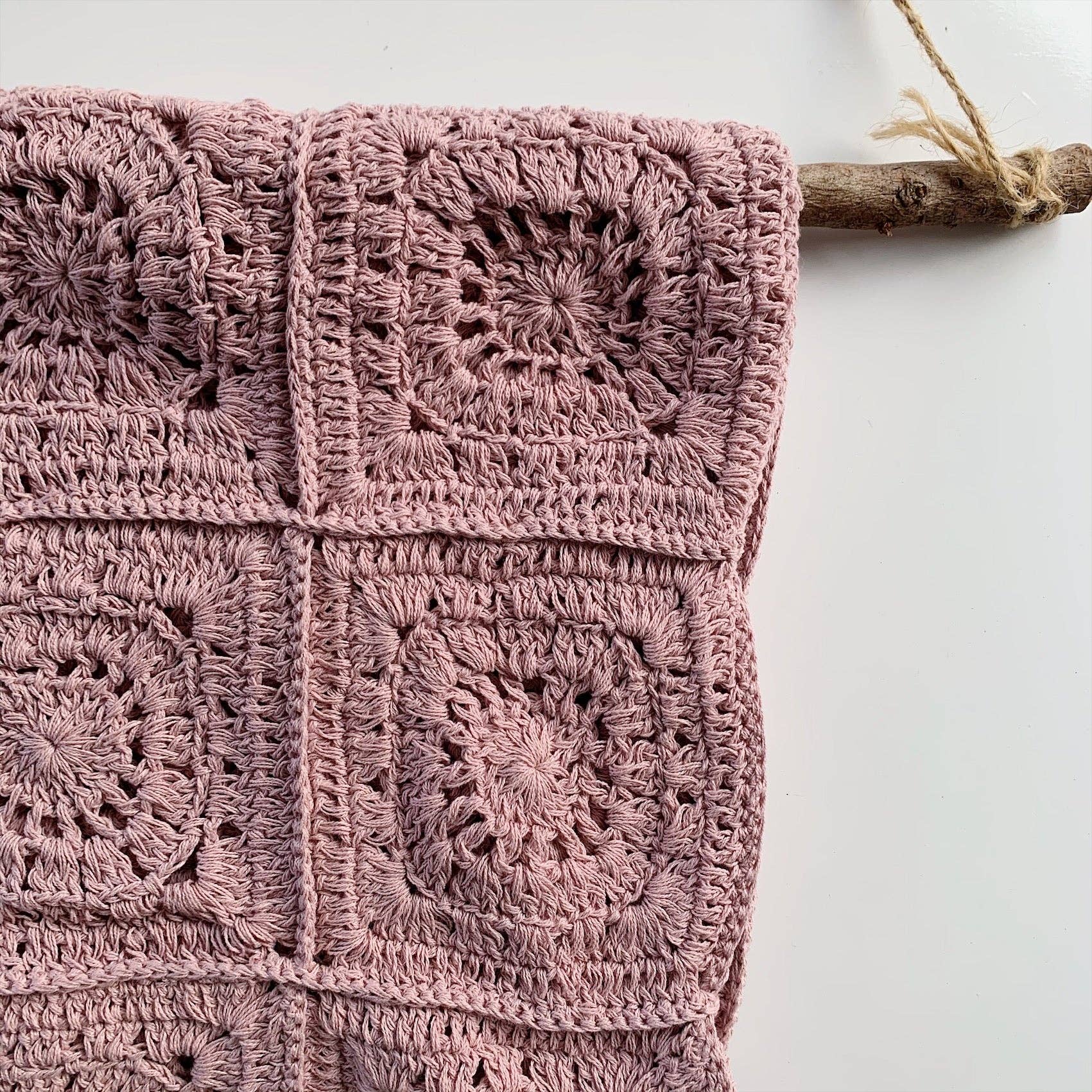 Ethically hand made in India from 100% organic cotton. This blanket is lovingly designed by me. Made up of crochet squares inspired by the blankets my Grandma Elsie used to make, these beautiful designs are then stitched together to form a pram blanket by artisans in India. Each square is a detailed design and each stitch made with so much love, an heirloom gift to be treasured forever.