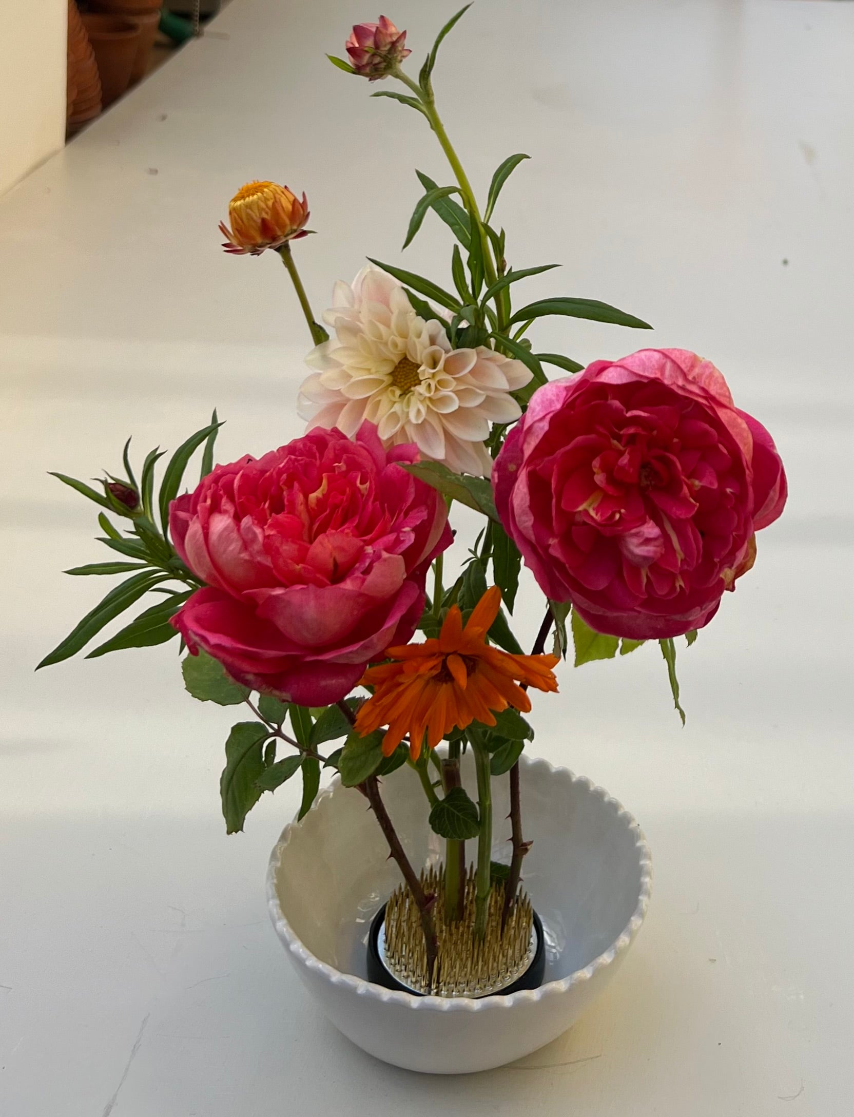 The brass pins are sturdy enough for woody material, but work equally well with softer flower and foliage stems.