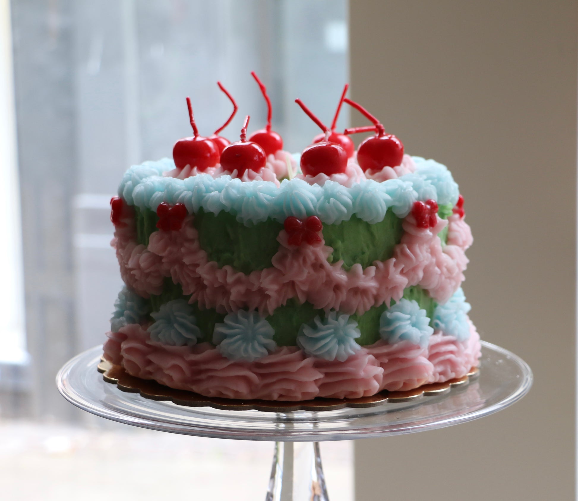Cereria Introna has been producing candles since 1840. Handmade in Puglia, Italy, the Cake Candle is meticulously crafted to resemble a real dessert. It takes whimsy to the absolute extreme. Featuring fluffy colourful icing in a vintage Lambeth style, and six fresh cherries popped on the top. This cake has six cherry wicks, and one wick in the middle, it provides a warm glow that creates a cozy and inviting atmosphere. Ideal for burning or as an elegant decorative piece.