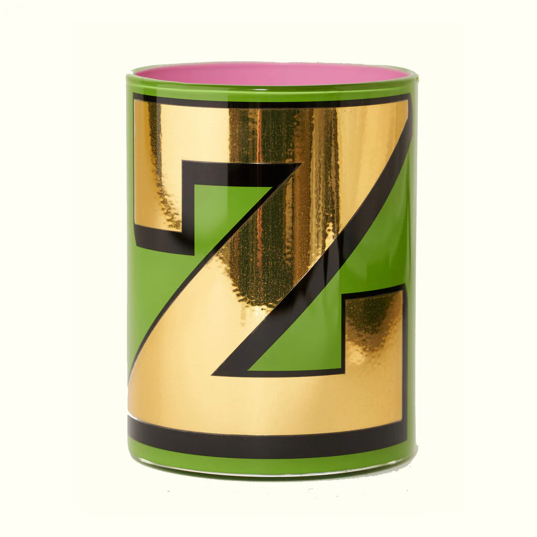 Smooth glass tumblers inlaid with a gold vinyl letter or symbol, backed with a different coloured lacquer and a topcoat of glossy varnish.